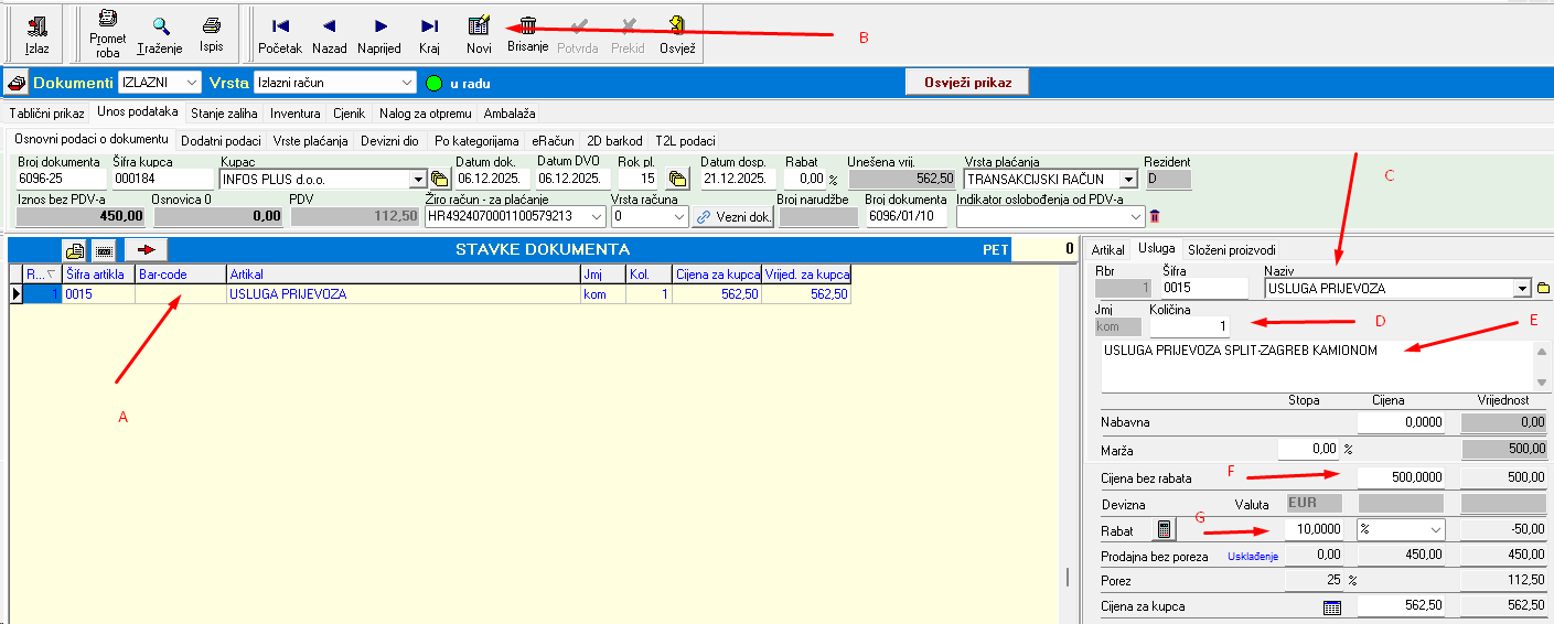 Kreiranje stavke računa na primjeru unosa usluge
