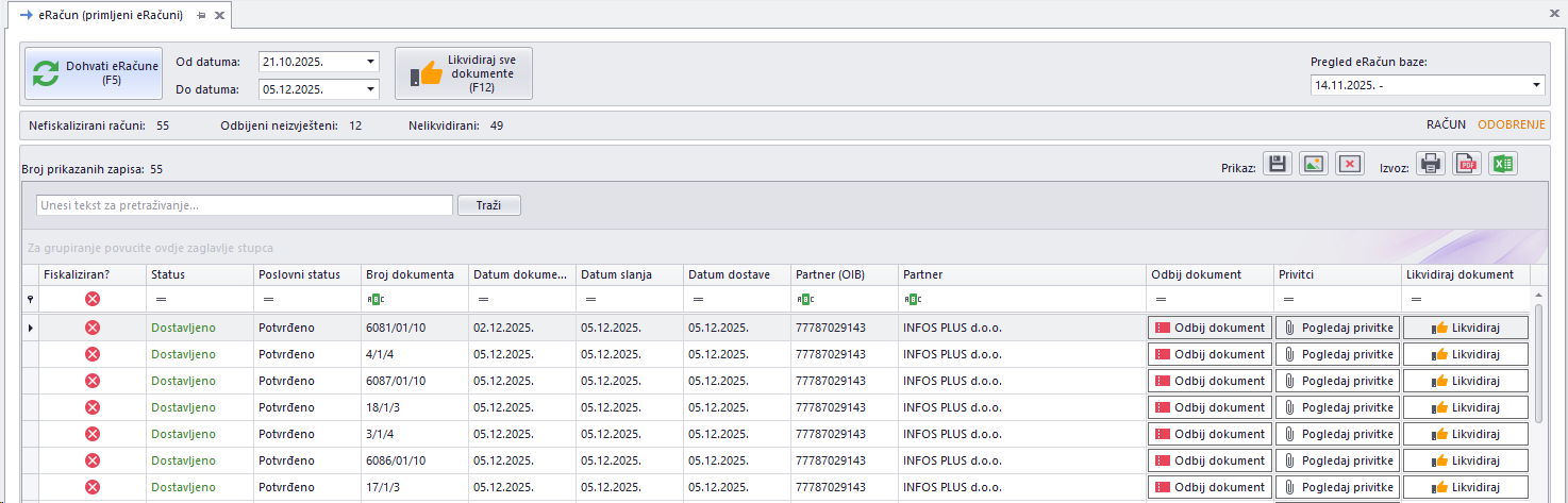 Na formi modula Poslani eRačuni se prikazuju svi primljeni eRačuni te njihovi Statusi.